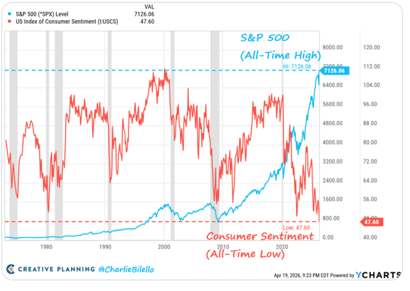 To use an old analogy, Wall Street is optimistic, and Main Street is pessimistic. The chart above illustrates. (Source: https://x.com/charliebilello/status/2046037937817563147/photo/1)