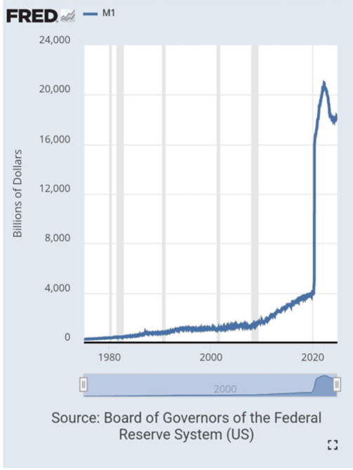 The chart on this page is from the US Federal Reserve, and it reports the M1 money supply.