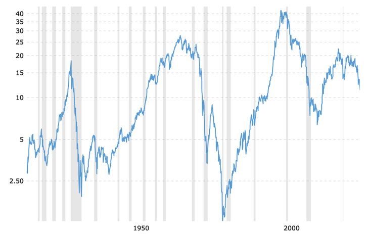 The chart here illustrates the Dow to Gold ratio going back to 1915. The ratio is calculated by taking the value of the Dow Jones Industrial Average and dividing by the price of gold per ounce.